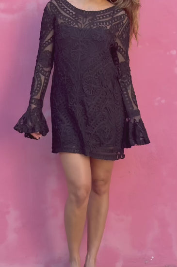 This nylon STRETCH mesh dress has tape work embroidered on top.